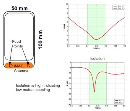 還有一種可行的解決方案,使用SkyCross公司提供的隔離模式天線技術(shù)(iMAT),從相同的天線結(jié)構(gòu)產(chǎn)生兩種不同的模式。iMAT天線結(jié)構(gòu)放置在手機(jī)的一端;兩個(gè)饋點(diǎn)分別運(yùn)行不同的輻射模式。這兩個(gè)饋點(diǎn)是相互隔離的,不會(huì)發(fā)生互耦導(dǎo)致的損耗,因此每種模式的效率都很高。另外,輻射圖案是不同的,因此會(huì)產(chǎn)生一個(gè)較低的相關(guān)系數(shù)。圖4描述了iMAT天線的實(shí)現(xiàn)原理,從圖中可以看到,在相同天線結(jié)構(gòu)上的兩個(gè)饋點(diǎn)之間的隔離。