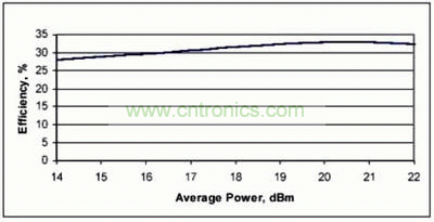 驅(qū)動(dòng)級(jí)對(duì)總體功耗也有貢獻(xiàn)。包括驅(qū)動(dòng)級(jí)在內(nèi)的功率添加效率(PAE)在7.8dB后退點(diǎn)處大于33%,此后退效率可以在廣泛的電源中實(shí)現(xiàn)。圖5顯示了各種電源電壓下放大器后退7.8dB時(shí)的效率,注意,確實(shí)有兩種方式控制放大器的瞬時(shí)輸出功率,即異相和改變電源電壓。電源電壓通常用于緩慢改變平均輸出功率,相位角用于快速改變信號(hào)的瞬時(shí)包絡(luò)線。