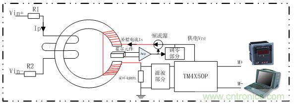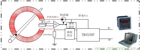 閉環(huán)式霍爾電流變送器是在直測式霍爾電流傳感器的基礎(chǔ)上發(fā)展起來的,主要由原邊電路、聚磁環(huán)、霍爾器件、次級線圈和放大電路、采樣電路、調(diào)零電路以及隔離變送模塊組成,如圖1。主回路電流IP 在聚磁環(huán)所產(chǎn)生的磁場,通過一個次級線圈的電流產(chǎn)生的磁場進(jìn)行補(bǔ)償,使霍爾器件始終處于檢測零磁通的工作狀態(tài)。流經(jīng)次級線圈的電流Is經(jīng)過精密電阻RL進(jìn)行采樣,為了減小恒流源的負(fù)載能力,此精密電阻RL的阻值較小。精密電阻將電流信號變換成mV的電壓信號,此信號經(jīng)過濾波器的濾波作用后直接接入金升陽TM系列信號調(diào)理模塊進(jìn)行信號隔離放大變換,變換換成工業(yè)需要的標(biāo)準(zhǔn)信號,如4-20mA、0-20mA、 l-5V、0-5V等標(biāo)準(zhǔn)直流信號,供給智能儀表顯示或者直接供給現(xiàn)場PLC或DCS系統(tǒng)使用。如果原邊電流Ip發(fā)生變化,則Ip產(chǎn)生的磁通發(fā)生變化,則在霍爾元件的兩表面產(chǎn)生電勢差,此電勢差經(jīng)過運(yùn)放的放大作用,直接控制Is補(bǔ)償電流的大小,此補(bǔ)償電流恰好與被測電流的方向相反,從而補(bǔ)償了原來的磁場,使得霍爾器件處于零磁通的狀態(tài)中。所以Is的電流可以真實(shí)地反映出原邊Ip的電流的變化,反應(yīng)速度快。