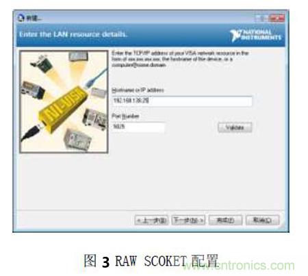 啟動Masurement & Automation Explorer 軟件,選擇設備和接口,在添加網絡設備中,使用Manual Entry of Raw Scoket(手動輸入原始SOCKET)方式連接,ZDS2024 示波器采用端口號5025 來接收SCPI 命令。如圖2和圖3所示。設置好后,可進行測試,確保連接成功。
