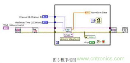 左邊的三個控制用于輸入設置,包括連接的VISA 資源名稱,獲取數據的通道,最大延遲時如何實現對示波器的遠程控制間。右邊為結果波形顯示控件。設計好前面板以后,就可以進入程序框圖設計了。在VI 的程序框圖中的Function 面板中,選擇“儀器I/O”可以找到有關ZDS2024 的驅動庫的模塊,可以在程序框圖中直接使用,設計結果如圖5所示。
