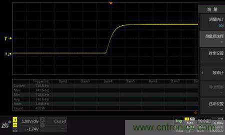 首先接入一個1M的方波信號,一鍵捕獲得到正常波形,點擊【Display】將顯示類型改為點顯示,將時基檔位調(diào)到50ns/div,讓全屏采滿700ns;點擊【Measure】,打開測量統(tǒng)計,點擊測量選項中的觸發(fā)計數(shù)器即波形每秒觸發(fā)的次數(shù)同理可測出330kwfms/s的波形刷新率。如下圖所示: