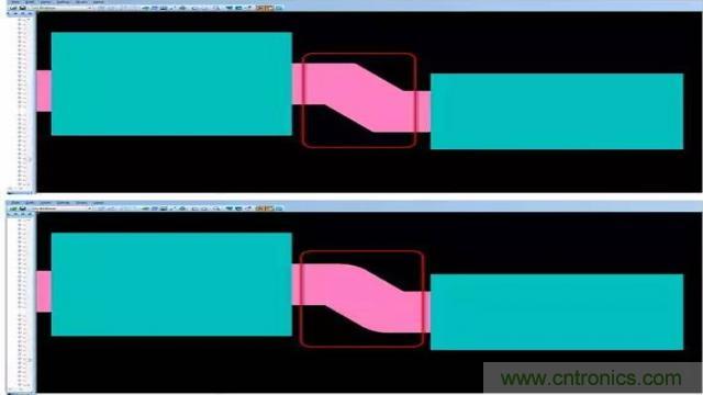 設(shè)計(jì)用于射頻和微波的銅皮形狀時(shí),一個(gè)很重要的方面是能夠創(chuàng)建帶尖拐角的Gerber 文件。優(yōu)秀的PCB設(shè)計(jì)工具可以簡化這一過程。例如,使用50 毫米線條繪制形狀與使用50 毫米圓形光圈繪圖相比,往往令設(shè)計(jì)具有較小的半徑。設(shè)計(jì)工具在創(chuàng)建Gerber 文件時(shí),可通過正確地自動(dòng)轉(zhuǎn)換線條寬度來獲得尖拐角(圖2)。