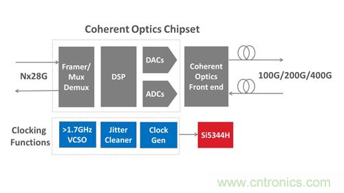 通信市場中最大增長驅(qū)動因素之一是業(yè)內(nèi)城域網(wǎng)絡和數(shù)據(jù)中心互聯(lián)(DCI)領(lǐng)域從10G到100G的轉(zhuǎn)變。相干光學技術(shù)可用于100G和400G應用,因為它使得服務提供商能夠通過現(xiàn)有的光纖發(fā)送更多的數(shù)據(jù),減少為帶寬擴展而進行網(wǎng)絡升級的成本和復雜性。當前用于相干光的定時解決方案在成本和尺寸方面還未達到最優(yōu)化,需要VCSO、時鐘發(fā)生器和分立器件的多樣化組合。