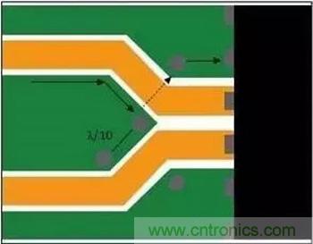 時(shí)鐘分布或合成器設(shè)備路由出來(lái)、用于承載相同頻率的跡線集群可能相鄰而行,因?yàn)楦蓴_源音調(diào)已經(jīng)存在于接收器線路上。不過(guò),分組的線路最終會(huì)分散。分散時(shí),應(yīng)在分散線路之間提供接地灌流,并在其開始分散的地方灌入通孔,以便感應(yīng)回流沿著額定回流路徑流回。在圖3中,接地島末端的通孔可使感應(yīng)電流流到參考層上。接地灌流上其它通孔之間的間隔不要超過(guò)一個(gè)波長(zhǎng)的十分之一,以確保接地不會(huì)成為共振結(jié)構(gòu)。
