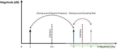 不過,你怎么能知道6Hz正弦波將會在1Hz和8Hz時出現(xiàn)混疊呢?在頻率域內(nèi)觀察混疊會使得這一點變得很明顯。當使用ADC進行采樣時,輸入信號的頻率成分,從DC開始,在數(shù)倍于采樣率的頻率上重現(xiàn)。現(xiàn)在,你應該明白術語“折返”為什么經(jīng)常被用來描述信號的混疊方式了—如果你沿著虛線將圖3折疊起來看,這些信號互相之間完美地重疊在一起。