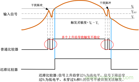 觸發電平只是一根參考電壓,而實際的波形在邊沿處是存在抖動的,如圖8所示,圖中波形的干擾非常小,但是上升沿還是存在鋸齒狀,當噪聲很大時抖動會更劇烈。如果想穩定觸發波形的上升沿,則需要在觸發電平的上下范圍內使用遲滯比較,以過濾觸發電平附近的波形抖動和毛刺。這個遲滯范圍就是觸發靈敏度。