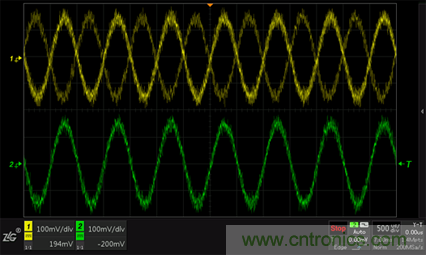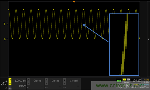 觸發耦合其實就是一種對觸發信號的低通或高通濾波。因此可對噪聲大的信號加入“高頻抑制”耦合,過濾掉其中高頻部分,使得波形觸發穩定如圖5所示。
