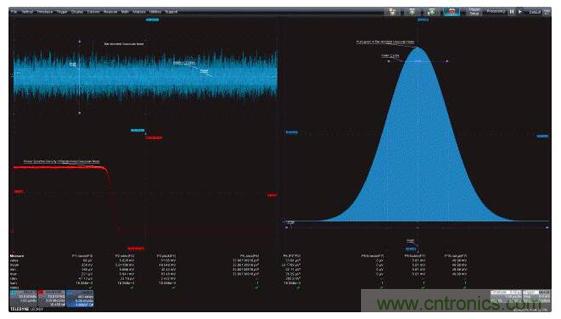 圖1:左上圖是帶寬受限的高斯噪聲的時域圖,左下圖是功率譜密度,是帶寬受限噪聲的頻域圖;右面的柱狀圖是帶寬受限噪聲的統計圖。這三個視圖都因采用了有助于對測量進行量化的測量參數而得到增強。