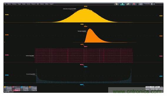 在許多應用中,兩個或多個隨機過程可能發生交互。當這種情況發生時,過程的概率密度會進行數學卷積運算。一個常見的例子是結合了隨機和確定性抖動分量的時序抖動。圖5顯示了結合在一起的高斯和正弦分量,源分布位于上面兩張圖,從上往下數的第三張分布圖是兩個源卷積的結果。許多先進的示波器提供可選的抖動或噪聲分析包,這些分析包可以將這些組合式分布分開,單獨測量分量。