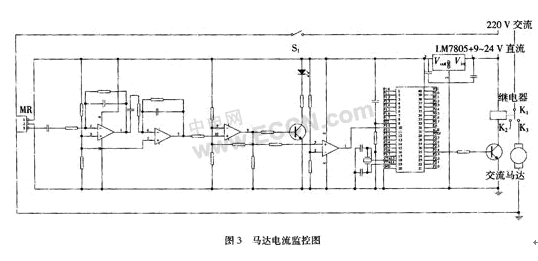 本文研制的電流傳感器已經在馬達監控方面獲得了實際應用。眾所周知,馬達一旦被意外卡死而停轉,電路中流過它的電流會遠遠高于正常工作的電流,而馬達長時間停轉的話,很容易被燒壞,本電流傳感器就是要感知馬達停轉的電流,從而把整個供電斷開,起到保護馬達的作用,其基本原理如圖3所示。
