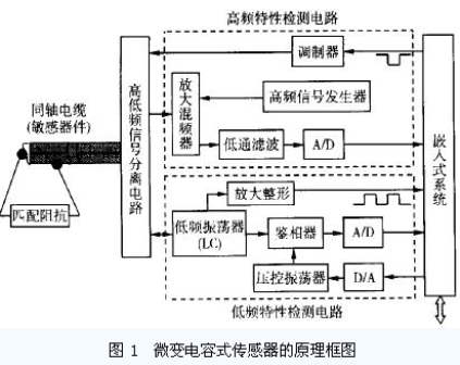 設計的微變電容式傳感器的原理框圖如圖1 所示。該傳感器由同軸電纜、高低頻信號分離電路、高頻特性檢測電路、低頻特性檢測電路和嵌入式系統等組成。高頻特性檢測電路監測同軸電纜特性阻抗的變化, 而低頻特性監測電路則監測同軸電纜分布電容的變化, 兩電路相互補充完成對同軸電纜的局部變形的監測和定位。