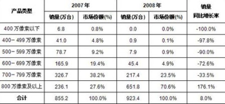 由于技術不斷升級,2008年數碼相機的像素進一步升級。雖然數碼相機總體市場保持了較為溫和的增長,但是不同像素類型的數碼相機增長幅度不盡相同。其中,800萬像素以上的數碼相機同比2007年有176.1%的增長;而800萬像素以下的所有數碼相機產品都出現了不同程度的下滑。其中400萬像素以下的數碼相機則完全退出市場。