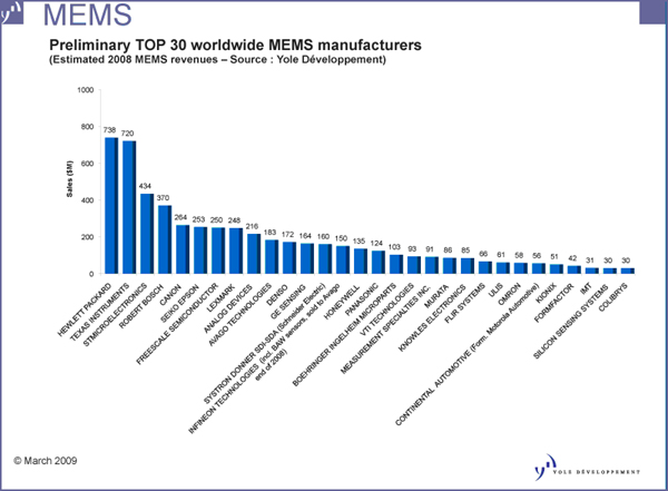 “前30名MENS制造商的總銷售額下滑了2%,為55億美元。”Yole Developpement公司CEO Jean-Christophe Elov表示。當(dāng)前的經(jīng)濟(jì)危機(jī)影響到了排名。
