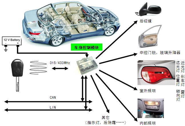 汽車中的遙控上鎖及開鎖的應用越來越普及。車身控制模塊使用315 MHz(美國、日本)或433MHz(歐洲)頻率,通過高頻接收和發送來實現遙控上鎖及開鎖功能。