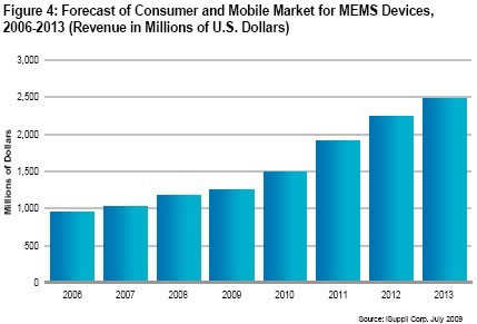 圖4所示為iSuppli公司對于面向無線與消費(fèi)電子應(yīng)用的全球MEMS營業(yè)收入的預(yù)測。