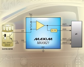 Maxim推出帶有模擬和數字輸出的雙通道、2線霍爾傳感器接口MAX9621。該器件可通過在模擬輸出端對線性信息對應的傳感器電流進行鏡像或通過經過濾波的數字輸出,使微處理器能夠監測霍爾傳感器的狀態。可編程設置數字輸出的輸入電流門限。高邊電流檢測架構省去了地回路引線,且不會發生地電位偏移,因而可降低50%的走線成本。MAX9621非常適合用于汽車車身控制器(例如:車窗升降控制器)。