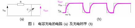 如圖1(a)所示,在RC網(wǎng)絡(luò)施加周期性充電電壓Vin,測(cè)量Vout會(huì)得到如(b)的時(shí)序,通過檢測(cè)充電開始到Vout到達(dá)某一門限值的時(shí)間tc的變化,就可以判斷出是否有人體接觸。圖2顯示出有人體接觸時(shí)充電時(shí)間會(huì)變長。
