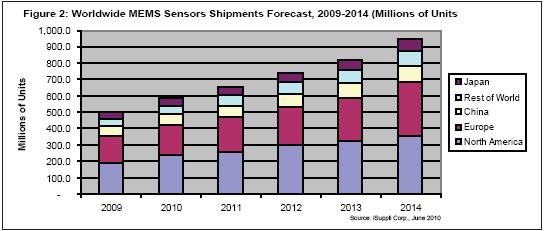 鑒于中國汽車出貨量迅速增長,在該地區(qū)已經(jīng)建立據(jù)點的供應(yīng)商,如Bosch和Continental,都逃過了經(jīng)濟衰退的最嚴重影響。2009年中國市場占總體MEMS消費量的11%,未來幾年將繼續(xù)增長,到2014年將成為全球第三大市場,領(lǐng)先于日本和“世界其它地區(qū)”。iSuppli公司認為,這些動態(tài)未來五年對于MEMS傳感器供應(yīng)商來說是好消息。