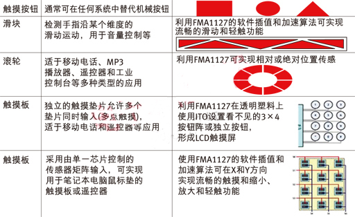 相對于傳統機械按鈕、滑塊、轉輪和開關,觸摸傳感器控制提供了靈活、可靠且高性價比的替代方案。最新的觸摸傳感器為設計者發揮其創造性創造了條件,設計者在開發接口時可隱藏或露出按鈕、或采用其他形態觸摸板的模式。表2和圖4顯示了不同的傳感器形狀和應用。