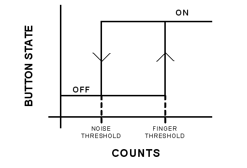 該轉(zhuǎn)移函數(shù)中的遲滯提供了開(kāi)關(guān)狀態(tài)之間的干凈利落的轉(zhuǎn)換,即使計(jì)數(shù)是有噪聲的情況下也不例外。這也為按鍵提供了一種反跳功能。低門(mén)限被稱(chēng)為“噪聲門(mén)限”,而高門(mén)限則被稱(chēng)為“手指門(mén)限”。門(mén)限水平的設(shè)定決定了系統(tǒng)的性能。當(dāng)覆蓋層非常厚時(shí),信噪比很低。在此類(lèi)系統(tǒng)中設(shè)定門(mén)限水平是一項(xiàng)具有挑戰(zhàn)性的工作,而這恰好是電容式傳感設(shè)計(jì)技巧的一部分。