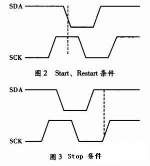 Start和Stop條件:主機(jī)通過發(fā)送Start條件啟動(dòng)通信,Start、Repeated Start條件如圖2所示,Stop條件如圖3所示。