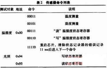 (2)地址與測試對象命令。該命令包含3個(gè)地址位和5個(gè)命令位,其后為應(yīng)答ACK位,表示SHT11正確收到命令。傳感器命令列表,如表2所示。