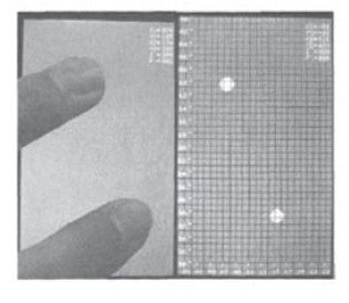 實(shí)際電極設(shè)計(jì)中,每對(duì)感應(yīng)單元設(shè)計(jì)為多組電極,并根據(jù)Lens的厚度設(shè)計(jì)電極面積以及間隙大小。間隙過(guò)大會(huì)導(dǎo)致線縫可見(jiàn),因此使用假電極進(jìn)行填充使線縫在30μm以內(nèi)則可以避免上述問(wèn)題。經(jīng)過(guò)實(shí)際測(cè)試,在實(shí)現(xiàn)單點(diǎn)觸控基本功能的同時(shí),能夠?qū)崿F(xiàn)兩點(diǎn)觸控,滿足設(shè)計(jì)要求。操作效果如圖5所示。