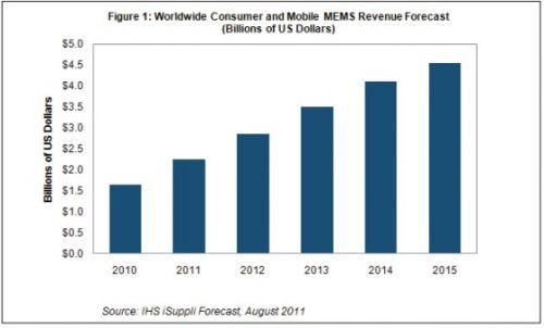 據(jù)IHS公司的消費(fèi)與移動MEMS市場研究報(bào)告,微機(jī)電系統(tǒng)(MEMS)市場中最大和最有活力的領(lǐng)域是消費(fèi)與移動器件,通過積極開拓智能手機(jī)和平板應(yīng)用,2011年MEMS市場將再度實(shí)現(xiàn)創(chuàng)紀(jì)錄的增長率。
