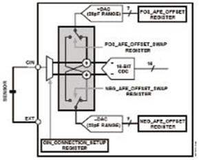 PCB還可能受到寄生電容的影響,這種電容最大可達(dá)20 pF,它會在電容觸摸傳感器視為受到按壓時,使閾值發(fā)生偏移,從而改變其靈敏度。為了對寄生電容進(jìn)行補(bǔ)償,可以采用對DAC編程的方法,以抵消CDC的輸入。對于各PCB來說,這種寄生電容是一致的,因此可以在制造PCB的時候進(jìn)行簡單的調(diào)整,這樣就不需要外部RC調(diào)諧元件,從而使材料、裝配和測試相關(guān)的成本最低。單獨調(diào)整每個傳感器的偏移,使設(shè)計者可以充分利用轉(zhuǎn)換器的分辨率(圖3)。