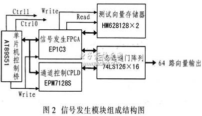 該模塊由單片機控制橋(AT89S51)、測試向量存儲器(靜態存儲器HM628128x2,排列方式為256 Kx8 bit)、信號發生FPGA(Altera公司Cyclone系列PLD器件EP1C3)、通道控制CPLD(Altera公司MAX7000系列PLD器件EPM7128S)及三態選通門陣列(74LS126x16)組成,模塊組成結構如圖2所示。