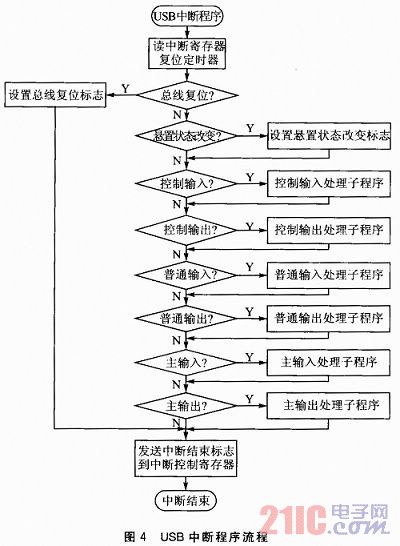 因?yàn)镃8051F321的USB模塊高度集成化,所以對(duì)USB接口的設(shè)計(jì)主要是USB固件程序的設(shè)計(jì)。其中最重要的是USB描述符和USB傳輸中斷的處理。當(dāng)USB中斷到達(dá)時(shí),C8051F321首先讀取3個(gè)中斷寄存器(CMINT、IN1INT和OUT1INT)來判斷中斷來源(USB復(fù)位中斷、端點(diǎn)0中斷、端點(diǎn)1輸入中斷、端點(diǎn)2輸出中斷),然后跳入相應(yīng)的處理模塊進(jìn)行處理。USB中斷程序流程如圖4所示。