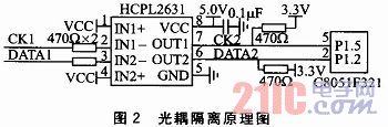由于系統(tǒng)經(jīng)常工作在工業(yè)現(xiàn)場(chǎng)等領(lǐng)域,各種電磁干擾很常見,為了使系統(tǒng)能穩(wěn)定工作,采用光耦隔離技術(shù)將傳感器和單片機(jī)隔離。光耦隔離原理圖如圖2所示。光耦器件采用HCPL2631高速光耦,輸出引腳OUT1和OUT2經(jīng)過上拉電阻處理后,將CK2和DATA2信號(hào)傳輸給C8051F321單片機(jī)處理。
