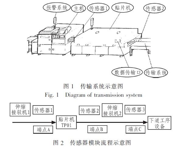 如傳感器流程示意圖1、圖2所示,假設(shè)一塊PCB的編號為01,首先從通過傳輸設(shè)備伸縮接駁機(編號為CS01)進入設(shè)備貼片機(編號為TP01)進行操作貼片流程,完畢之后再從貼片機(編號為TP01)進入傳輸設(shè)備接駁機(編號為CS02),再通過傳輸設(shè)備接駁機(編號為CS02)進入下一個SMT生產(chǎn)設(shè)備,如此反復。