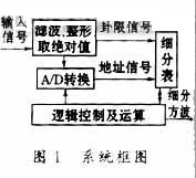細(xì)分主要由以下幾個(gè)部分構(gòu)成,取絕對(duì)值、提取卦限信號(hào)、A/D轉(zhuǎn)換、查細(xì)分表、邏輯運(yùn)算等。系統(tǒng)框圖如圖1所示。