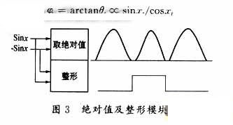 從原理上可以看出,該細(xì)分模塊的技術(shù)關(guān)鍵是比較器整形產(chǎn)生的卦限信號(hào)和A/D模塊產(chǎn)生的地址信號(hào)必須同步,這是能否正確細(xì)分的關(guān)鍵。因此,在電路設(shè)計(jì)過(guò)程中,比較器的滯后及其抗干擾能力是必須考慮和解決的問(wèn)題。在抗干擾方面,采用差分放大,可以有效地抑制共模干擾。考慮其滯后問(wèn)題,采用整形電路與取絕對(duì)值電路分離,可以通過(guò)調(diào)節(jié)各個(gè)運(yùn)放的直流參數(shù),使得卦限信號(hào)與絕對(duì)值信號(hào)能夠近似同步,否則,產(chǎn)生的細(xì)分方波將會(huì)在過(guò)零處變得混亂。如圖3所示,對(duì)其中sinx信號(hào)取絕對(duì)值及整形,這樣一來(lái),既方便了調(diào)試,也避免了干擾及比較器的滯后問(wèn)題。