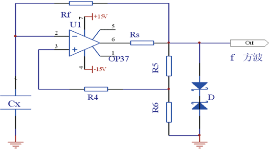 傳統的電容檢測方法有電荷轉移法和脈寬調制法,電荷轉移法常用于單電容檢測,脈寬調制法常用于差分電容檢測。圖3是方波發生器電路,產生的方波頻率