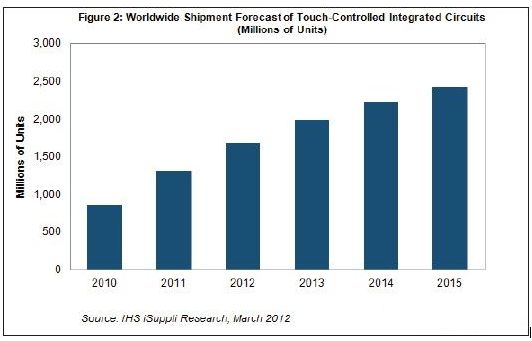 在蘋果公司iPhone和iPad暢銷的推動下,智能手機和媒體平板中的觸控屏急劇增長,從而導致觸摸控制器集成電路(IC)出貨量在短短五年內將增長近兩倍。