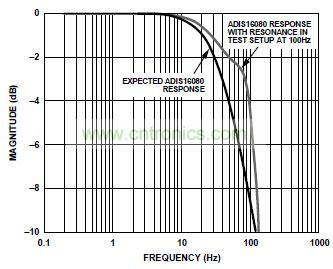 確定傳感器步進響應對于隔離在確定帶寬特性時觀察到的諧振條件很有用。圖1所示為一種采用ADIS16080的系統的頻率響應。圖中所示諧振頻率為100 Hz。開始時,該諧振到底是傳感器行為導致,還是系統中的機械諧振所導致,這并不清楚。幸運的是,步進響應(如自測功能所確定)可以區分這兩種效應。圖2顯示了兩種條件下的坐標曲線圖:測試設置導致的諧振和傳感器本身導致的諧振。