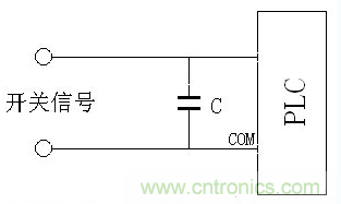 有時PLC或其它控制器的開關(guān)量輸入由于受外界干擾影響而瞬間輸入錯誤,導致PLC產(chǎn)生誤動作,這時在PLC的輸入端并上一個0.1uF的小電容就可以消除這種干擾,如下圖所示: