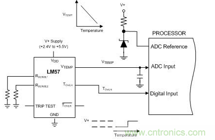 LM57不僅集成了分立熱敏電阻電路的功能,還改進了其性能。如圖2所示,我們可以看到元件數量變少了,但功能卻增加了。例如低態跳脫點輸出和輸入針腳使系統可以在原位置測試LM57的功能。