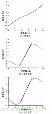 經Matlab計算普通半橋在3~7 mH段,電壓變化范圍1.5~3.5 V,電壓對電感的靈敏度為0.5V/mH。線性度近似為1。對圖3(b)采用最小二乘法擬合直線后,在3.8~6.3 mH段,輸出電壓的變化范圍0.77~4.39 V。線性度可達2.39%,靈敏度為1.448 V/mH。