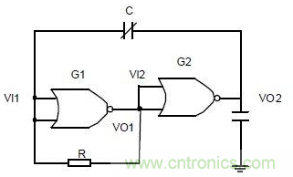 振蕩電路的作用是將電容的變化量轉(zhuǎn)化為頻率可變的方波。由圖3 可知,這是一個(gè)非對(duì)稱多諧振蕩器。或非門G1 工作在電壓傳輸特性的轉(zhuǎn)折區(qū),把它的輸出電壓直接連接到或非門G2 的輸入端。G2即可得到一個(gè)介于高低電平之間的靜態(tài)偏置電壓,從而使G2 的靜態(tài)工作點(diǎn)也處于電壓傳輸特性轉(zhuǎn)折區(qū)上。反饋環(huán)路中電容使電路在兩個(gè)暫穩(wěn)態(tài)之間往復(fù)振蕩。