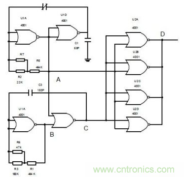需要指出的是,圖3 所示的濕度傳感器零點(diǎn)電容比較大,靈敏度不夠高,濕度從0%~100%RH,電容的變化量不超過(guò)30~50PF。為此,最好將零點(diǎn)電容消除掉,在實(shí)際設(shè)計(jì)中我們用兩片CMOS4001 集成電路對(duì)圖3 進(jìn)行改造,具體見(jiàn)圖4。