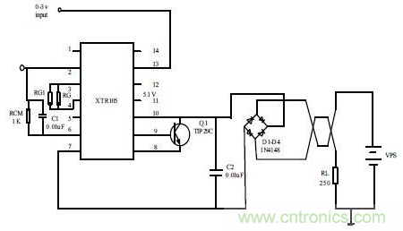 輸出的0~3V 電壓通過(guò)XTR105 芯片的2 和13 引腳輸入。調(diào)整3 和4 引腳間的電阻RG和RG1 的值,可以改變XTR105 芯片的內(nèi)置儀表放大器增益值,從而選定合適的測(cè)量范圍。RCM 取為1KO,它提供一個(gè)附加電壓降,使XTR105 的輸入電壓限制在共模方式下的電壓范圍內(nèi)。與RCM 并聯(lián)的0.01μF 旁路電容用于降低共模噪聲。