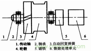 基于磁敏角度技術的拉線式位移傳感器的功能是將拉線的機械位移換成可以計量、記錄或傳送的電信號,主要由自動回復彈簧、輪轂、磁鐵以及數據處理單元等部分構成,結構如圖1所示。
