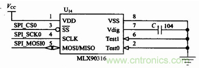 由于串行通信的輸出信號直接來自于MLX90316的內部DSP輸出,SPI輸出模式更穩定,誤差更小,并且具有更高的抗干擾能力。在本設計中,選用SPI接口,具體的硬件接口連接電路如圖3所示。在圖3中,MLX90316的SPI三根線與ARM LPC2136的SPl0口連接。SPI(SerialProtocol InterIace)總線接口是一種同步串行外設接口。這是一個4根信號線的串行接口協議,包括主、從兩種模式。這4根信號線分別是:時鐘線(SCK)、數據輸入線(MISO)、數據輸出線(MOSI)和從設備使能線(SS)。