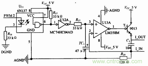 數據處理單元具備一路可控4~20 mA的電流輸出,用于現場指示儀表的驅動。具體的連接電路如圖4所示。其中PWM2連接ARM的PWM2引腳,PWM信號用于控制光耦的導通與截止,反相器主要用于波形的整定,根據磁敏角度和位移關系,建立數學模型,計算出PWM的占空比,從而達到電流大小調節的目的。