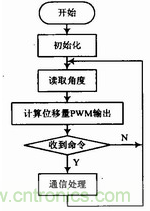 軟件編程主要包含3個模塊:PWM控制電流輸出模塊、RS 485通信模塊、MLX90316的SPI通信模塊,編程流程如圖5所示。PWM控制電流輸出模塊主要通過改變PWM的占空比來調節電流的大小。RS 485通信模塊主要用來接收上層系統的指令并根據指令將數據回傳。MLX90316的SPI通信模塊主要用于磁敏角度的讀取,SPI的通訊過程為:主控端先輸出1個0xAA以及1個0xFF作為通信起始信號,然后接著輸出8個0xFF,而從端會同時輸出2個0xFF、4個字節的角度信號以及4個0xFF,從而完成一次數據通訊。