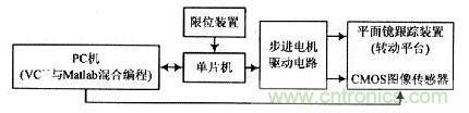 該系統主要由平面鏡跟蹤裝置、控制和驅動電路、方位限位電路、CMOS圖像傳感器(附巴德膜濾波片)等部分組成。系統總體設計框圖如圖1所示。跟蹤裝置實物圖如圖2所示,圖像傳感器固定在平面鏡中心。圖像傳感器產品主要分為CCD,CMOS以及CIS傳感器三種。目前CMOS型不僅價格低廉,而且已經實現數字化輸出,軟件可編程控制,大大降低系統設計的難度,提高系統設計的靈活性、抗干擾性和穩定性。
